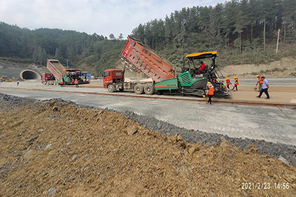 欧博abgSRP09-C5 MA摊铺机,,,,双机联铺助力贵州某高速蹊径建设,,,,施工路段约30公里,,,,作业宽度为12m,,,,作业厚度300mm,,,,作业速率快,,,,施工质量高,,,,获得监理的的一致好评。。。。